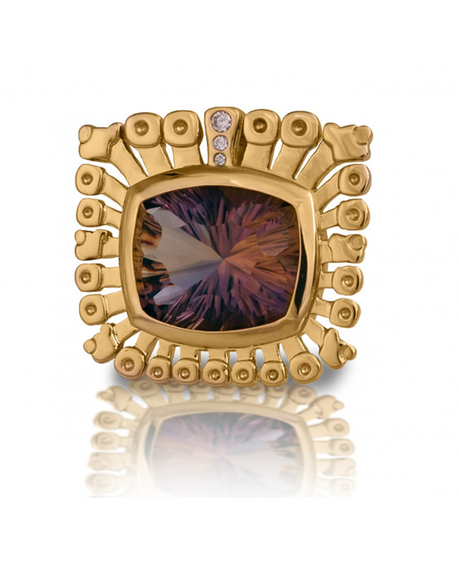 The intermingling, purple and gold hues gemstone, 15X13mm Cushion shaped AMETRINE BLEND has been meticulously selected from Anahi Mine’s rough and enhanced by in-house hand cut with inwards curved facets. This piece includes twelve 2mm and ten 1mm diamonds.