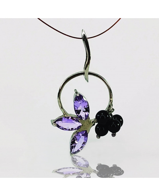 Perfectly clean purple gemstones, a pair of 12X6mm Marquise shaped AMETHYST has been meticulously selected from Anahi Mine’s rough and enhanced by in-house hand cut with inwards curved facets. This piece includes four 5mm onix spheres.