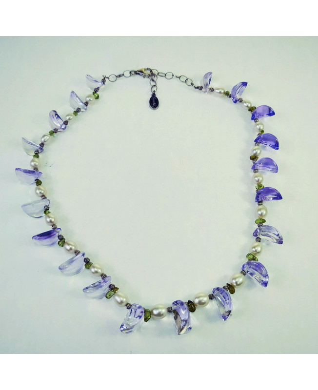 Polished Anahite, pearls, peridot chips, silver spacers, chain and lobster clasp. Total length 48cm.