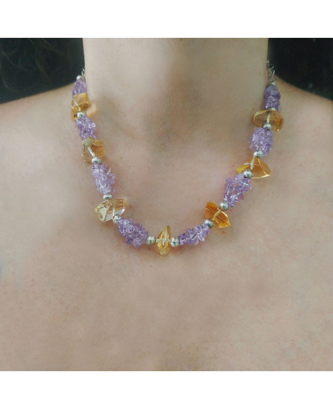 Free shape clean Citrine, Amethyst chips with 925 silver spheres, chain and lobser clasp. Total length 50cm.