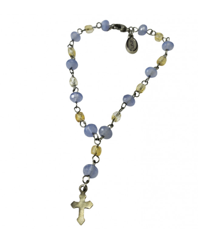 Denario de acero inoxidable con gemas facetadas de citrino y calcedonia, cruz de plata 925. Largo total 18cm.