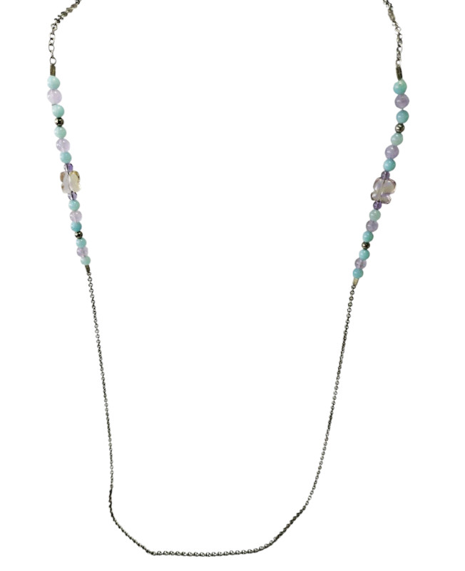 Esferas de Amatista y amazonita, mariposas de Ametrino. Cadena y seguros langosta de acero inoxidale. Largo total 81cm.