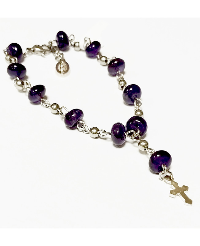 Ruedas de Amatista, cruz en plata 925, esferas, seguro langosta y accesorios en acero inoxidable. Largo total 22.5cm.