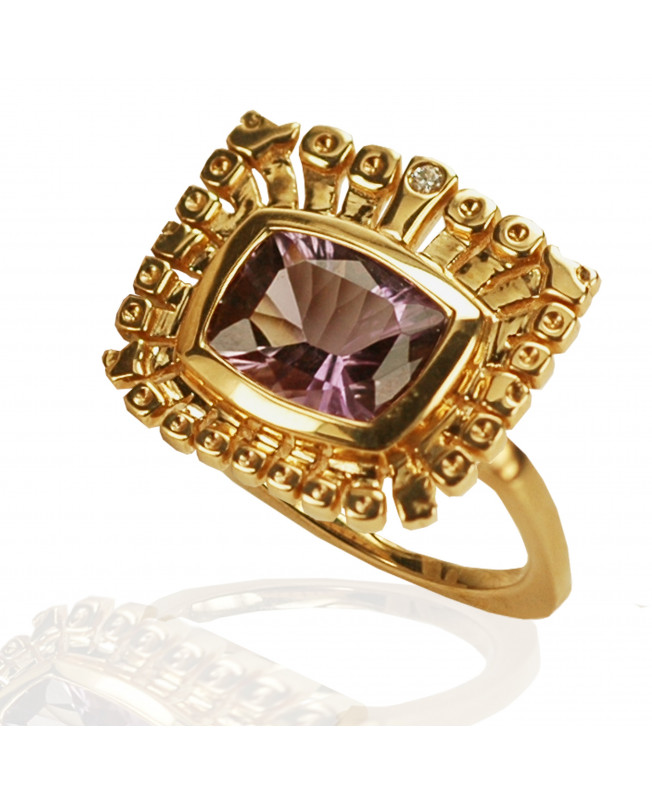 Gema de Ametrino (Bolivianita), forma Cushion, corte concavo, tamaño 10X8mm. Esta pieza incluye un diamante de 1mm.
