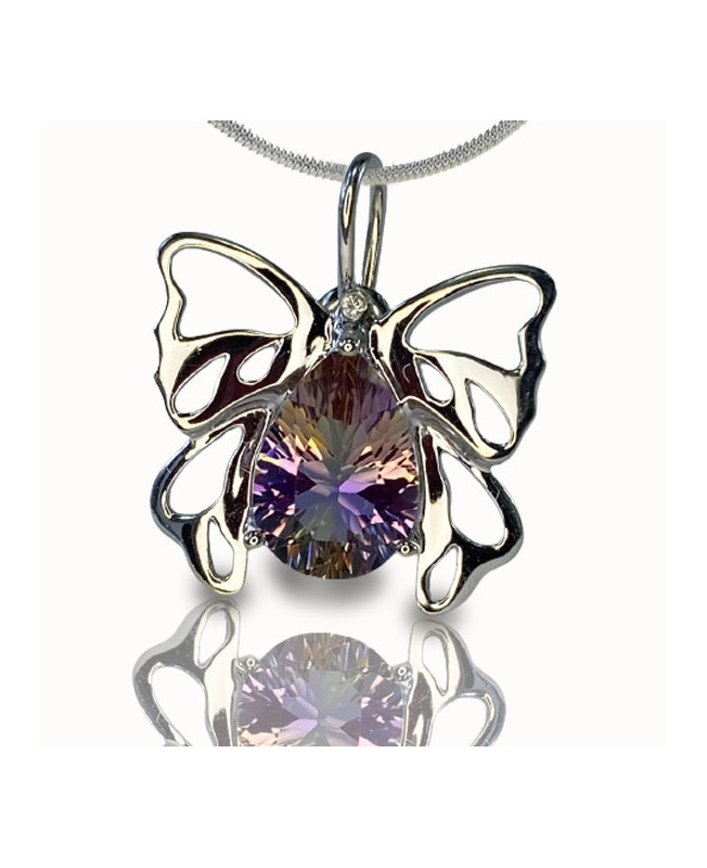Gema de Ametrino (Bolivianita), forma Gota, corte concavo, tamaño 10X7mm. Esta pieza incluye un diamante de 1mm.